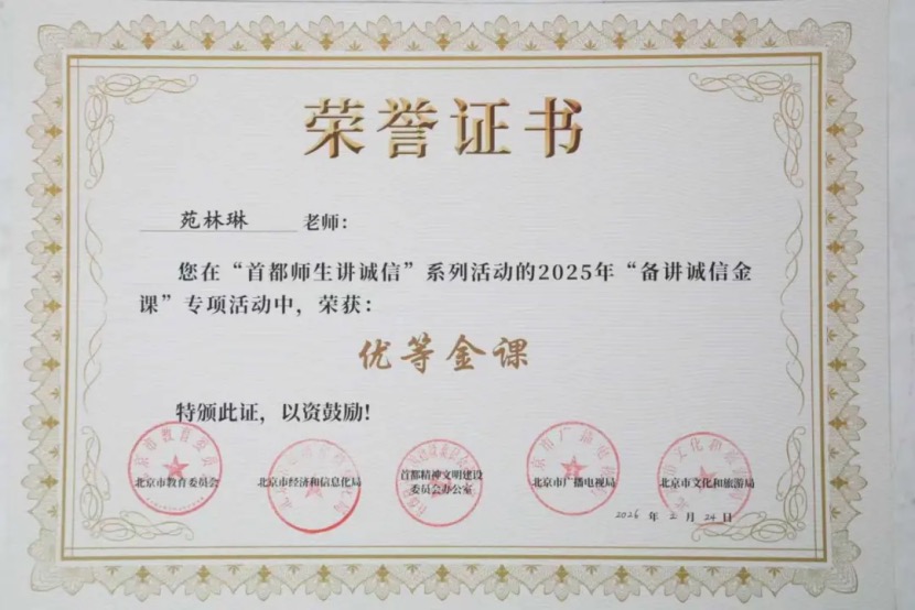 我院公共教学部苑林琳老师《英韵京腔,公话诚信》荣获市级 “诚信优秀金课”