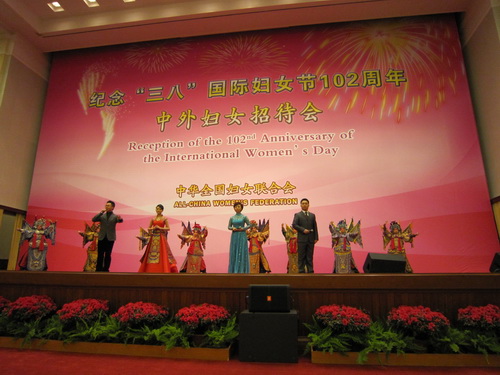 3月7日中国文联邀请北京戏曲艺术职业学院参加2012年《纪念“三八”国际妇女节102周年中外妇女招待会文艺演出》活动,院长王鸣铎一同参加了此次活动。下午3:00演出活动在人民大会堂二层宴会厅拉开了帷幕。这次演出活动由中华全国妇女联合会主办,中国文学艺术界联合会和中国舞蹈家协会承办,党和国家领导人、中央国家机关部以上的女领导、全国人大女常委、全国政协女常委、港澳人大女代表、政协女委员等,各界妇女代表以及驻华女大使、女外交宫、使节夫人、在华工作专家、专家夫人等嘉宾出席本次活动。