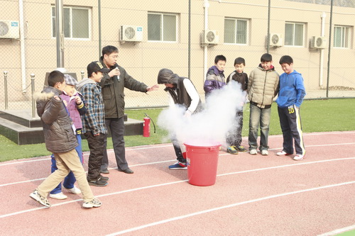 演习开始前,学生处先在操场对学生进行了消防安全教育。郭爱莲介绍了消防安全的基本常识,使同学们懂得了平常在公寓该如何防患火灾以及发生火灾时如何选择正确的逃生方法,从而达到安全自救的目的;并强调了演习过程中的注意事项和具体要求。学院保卫处主任姜文武为同学们讲解示范了灭火器的使用方法,并邀请几位同学进行了实际操作。