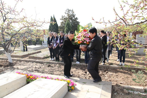 清晨7:30分大轿车驶向福田公墓,首先由李建副院长代表全院向新生们介绍了郝校长生平,并抒发了全院师生对先辈的崇敬与缅怀之情,向郝校长三鞠躬,随后献上花篮,学生每人手里一枝菊花,依次摆放到郝老墓前,整个活动庄严而肃穆。