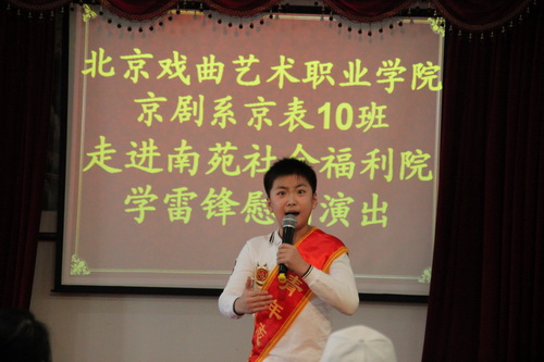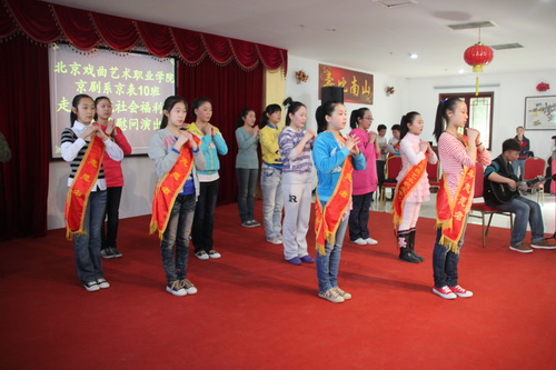 为发扬尊老爱老的传统美德,响应学院3月份学习雷锋、奉献爱心的号召,继去年到南苑福利院进行慰问活动之后, 2012年4月8日,经过前期的精心准备和排练,京表10班在京剧系主任许翠和班主任范雅静的带领下,再次来到南苑福利院进行了慰问演出。