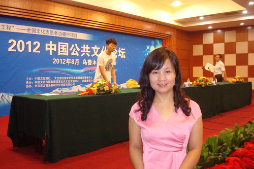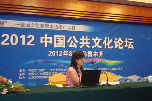 2012年8月28日,作为文化部、中央文明办开展的“春雨工程”——全国文化志愿者边疆行活动的组成部分之一, 2012中国公共文化论坛在新疆乌鲁木齐举行。文化部党组成员、副部长杨志今,新疆维吾尔自治区党委常委、宣传部部长胡伟等出席开幕式并讲话。来自全国等地的公共文化领域专家学者和全国各地公共文化服务机构的70余名负责人等参加了论坛。与会人士围绕公共文化服务与民族民间文化保护、公共文化服务品牌建设、文化志愿者队伍建设等主题进行了广泛交流。我院艺术研究中心主任、副研究员蒋淑媛做了题为《建立面向群众文化需求的公共文化品牌形象》的发言,她结合北京市戏曲文化在民众中的普及情况和北京市公共文化服务体系建设的创新举措提出了对于公共文化品牌形象的认识。提出了发现、培养和满足人民群众的文化需求是公共文化建设凸显品牌价值关键因素。获得了与会人员的一致好评。
