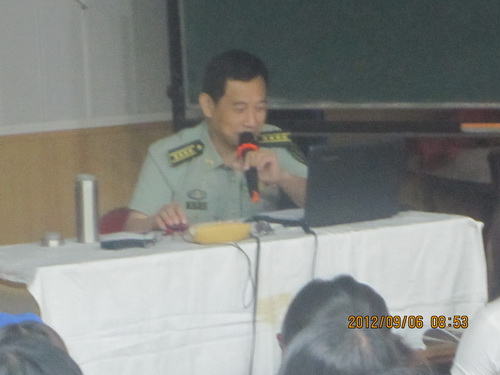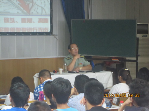 2012年9月3日至7日,学生处在五楼阶梯教室拉开了2012级高职新生入学教育的序幕。 首先,国防大学刘玉清、林建忠等7位教授分别为我院高职新生讲述了国防基本知识、古今的军事思想、军事高科技、现代战争知识和局部战争战例分析等军事理论知识,使同学们充分地了解了我国的国防情况,增加了同学的爱国情感和责任感。
