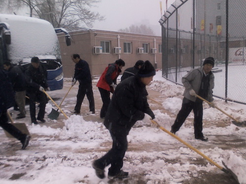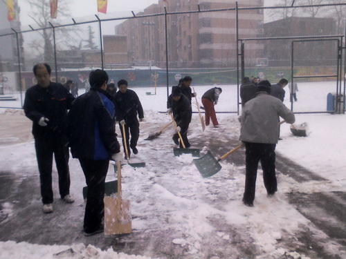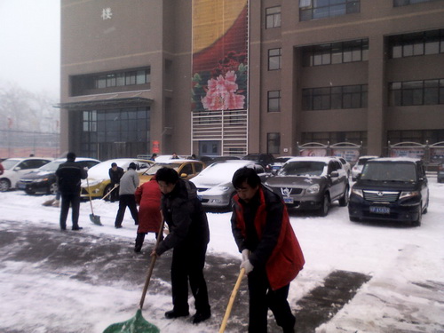 开展义务扫雪活动是后勤管理中心多年来一贯的优良传统。14日一上班,为尽快铲除路面积雪,后勤管理中心职工们戴着手套,挥起铁锹,在中心负责人姚宝强处长的带领下,投入到扫雪活动中去。在瑟瑟的寒风中,大家有的铲雪,有的扫雪,忙得不亦乐乎。经过两个小时的奋战,铲除了校园内主干道上厚厚的积雪。