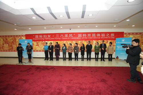 3月7日,为隆重纪念“三八国际劳动妇女节”,弘扬中国传统文化,“国际妇女 三八采风”国粹京昆体验之旅活动在我院举行。由我院协办,北京市京剧昆曲协会支持,北京市民间组织国际交流协会(简称“市民交协”)主办的此次活动邀请了近百名中外嘉宾参加。中联部妇委会主任沈蓓莉、市民交协、市友协常务副会长李晓强、驻会副会长潘友生、我院名誉院长孙毓敏、院长刘侗等嘉宾出席了活动。