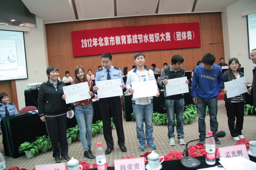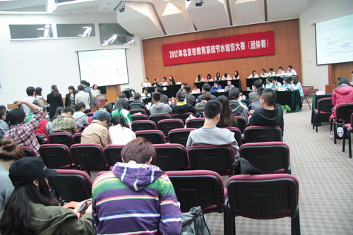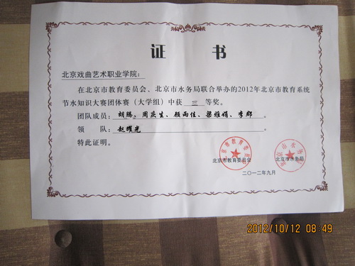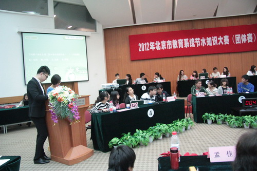 2012年10月11日,我院高职部五名学生代表,影视表演2011班胡腾、周庆生、李郡,舞美2011班顾雨佳,音乐2011班梁雅娟与五名舞蹈2012班的拉拉队员在学生处高职部赵耀光老师的带领下,参加了由北京市水务局、北京市教委共同主办的“2012年北京市教育系统节水知识大赛”。本次大赛旨在提高全市大中小学生节能减排意识和能力,北京市共有23所高等院校参加了此次活动。