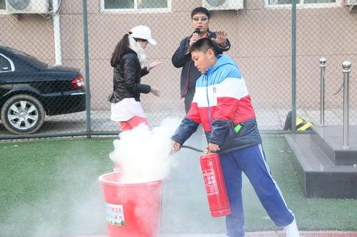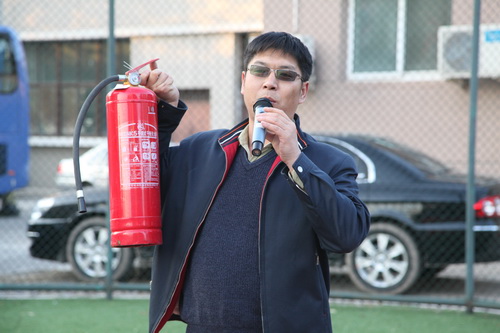 演习开始前,参加演习的所有学生先在操场集合,进行了安全常识教育。学生处主任郭爱莲向同学们讲解了火灾逃生的基本知识,以及火灾逃生中的注意事项,并说明了公寓逃生的路线。保卫处主任姜文武就如何使用灭火器向同学们进行了详细的说明和示范,并邀请一些学生进行了实际的演练操作。