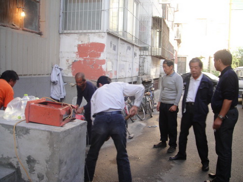 26日下午,家属楼有居民反映六至十四层的居民家中无法上水,面对突发情况,综合服务处房管科工作人员积极采取措施,立即检查事故原因并及时向上反映情况。主管副院长黄平和综合服务处处长姚宝强在第一时间来到现场,黄平副院长指示综合服务处要组织相关人员以最快的速度进行抢修,以保障及时供水。姚处长立即与专业管道维修人员联系,连夜施工紧急抢修。考虑到居民们的生活用水不受影响,维修期间房管科从办公室引出自来水接水装置供居民朋友们临时用水。