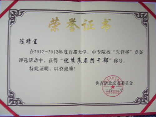 在团市委开展的2012-2013年度首都大学、中专院校“先锋杯”优秀团支部、优秀基层团干部、优秀团员竞赛评选过程中,我院以下团支部、基层团干部、团员获得奖励:
