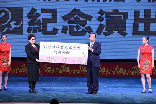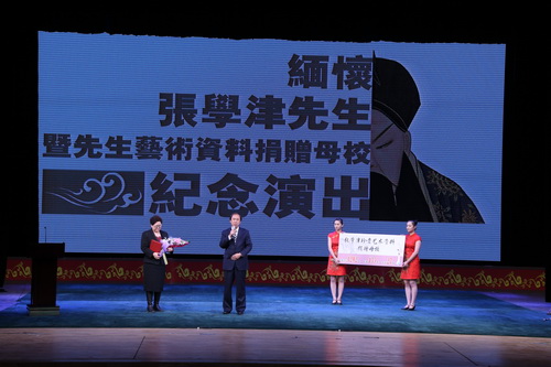 演出开始前,按照张学津先生遗愿,院长刘侗从张先生家属张丽敏女士手中接过了张学津先生生前艺术资料。珍贵的资料中不仅包括张先生在学习马派艺术时用过的影音资料,还包括先生成名后的相关演出资料。院长刘侗表示,感谢张先生相信北戏,把毕生所学、所用、所创作出的资料捐献给北戏,这对北戏的老师、学生们是一份及其珍贵的资料,对于马派艺术的传承,对于将张先生的艺术精髓传承下去有着不可估量的意义。北戏将以此为契机,在学院建设流派传承基地,将中国的戏曲文化流派艺术保留、传承下去。