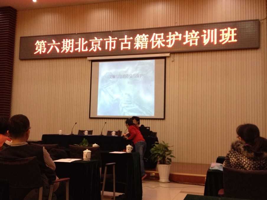 12月3号至5号,我院图书信息中心应邀参加了在房山区凯悦莱酒店举办的古籍保护第六期培训班。培训班由首都图书馆古籍保护中心举办。会议期间,邀请到了人民大学信息资源管理学院教师张美芳及国家图书馆馆员刘晨书,分别针对文献信息存储介质、保存环境以及古籍保护科技的应用与研究两方面,向学员进行了讲授。本次会议旨在加快古籍保护队伍建设,以便推进北京市古籍普查工作更加深