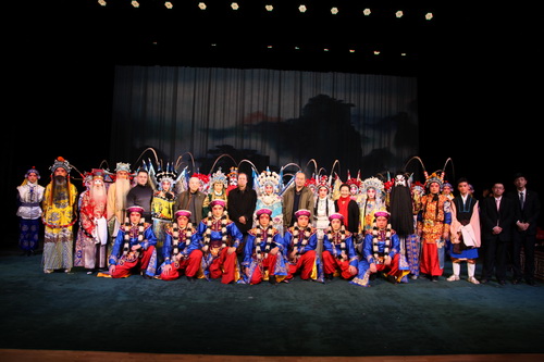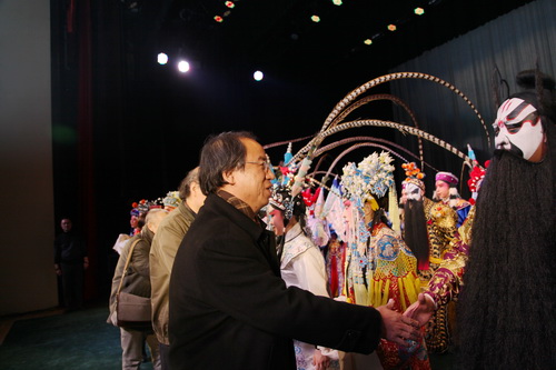 演出当天天津突降大雪,演员们上午11点即从天津出发,但由于高速封路,至晚上8点才到达剧场,原定7点开始的演出,被推迟至晚9点开演。演艺中心、院办、剧场、后勤、教研督导处等部门,在刘侗院长的领导下,团结一致,各司其职,认真做好专家接待以及对观众解释、安抚工作。同时,老师们尽全力保证后勤保障。在食堂师傅们的努力下,演员们吃上了热腾腾的饭菜。演员们在后台紧张化妆,我校师生和观众在台下耐心等候,秩序井然。