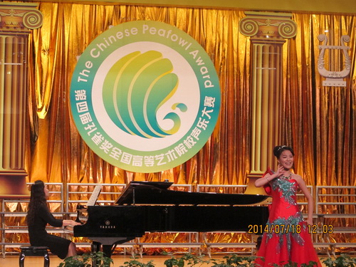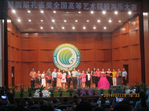 2014年7月19日,音乐系在系主任祝真伟老师的带领下,师生一行14人远赴云南昆明参加第四届“孔雀奖”全国高等艺术院校声乐大赛,经过近10天的激烈角逐,我院5组选手全部进入决赛,并最终取得2个一等奖,2个二等奖,1个三等奖的好成绩。因为我院选手的突出表现,组委会为我院颁发了“优秀组织奖”。“声乐孔雀奖”是中国声乐家协会组织的重要赛事,是中国声乐界唯一的综合性大奖,每两年举办一届。本届“孔雀奖”是由中国声乐家协会主办,云南文联及云南艺术学院承办。参加复赛选手多达1062人,覆盖艺术院校267所,复赛、决赛时间共计6天,(复赛选手百分之四十进入决赛),比赛地点设在云南艺术学院和云南师范大学。复赛设演唱奖,决赛设“一等奖”、“二等奖”、“三等奖”、“优秀奖”四个奖项。