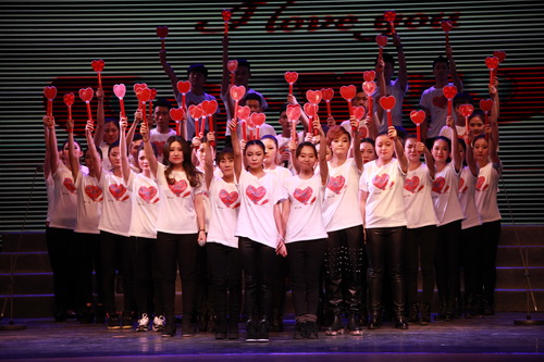 演出最后一首原创作品《因为有你》是整场毕业汇报的主题曲,由刘歆迪同学作词,并在音乐创作课谢文婷老师辅导下创作完成,并编配成了合唱曲,是高职音乐12全体学生献给母校北戏、献给音乐系、献给老师、家人、同学、朋友的一份毕业礼物。全体学生穿上了统一的班服,手持桃心荧光棒,在韩媛媛老师的静心编排下,最后全体学生围成了一个大大的桃心。当学生们深情用心地唱道“因为有你,我们在一起”,瞬间感动了全场,不仅仅台下的师生,就社会观众也都纷纷饱含泪光。让我们一同祝福这些才华横溢、青春阳光的孩子们,因为有你们,明天才会更加美好灿烂辉煌。