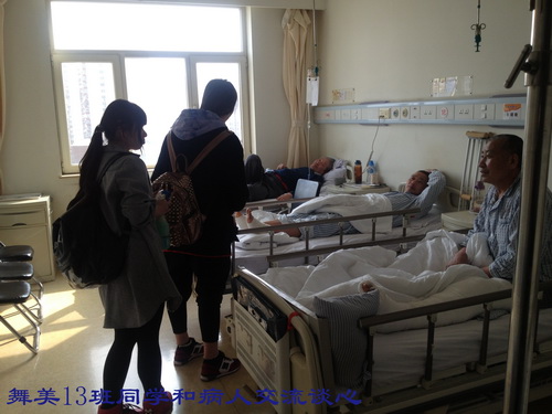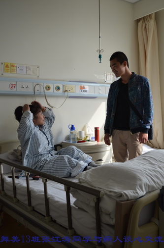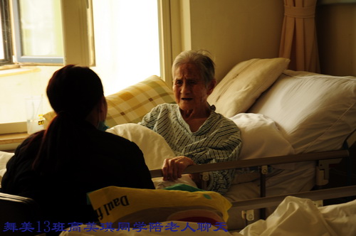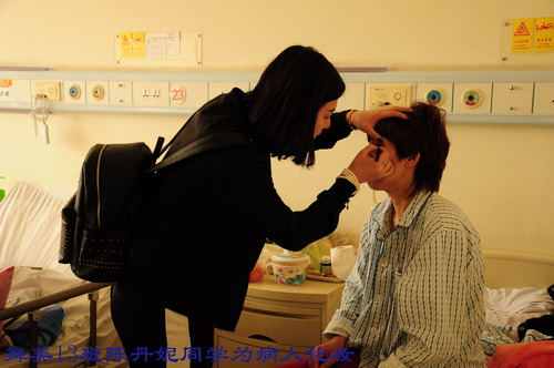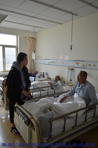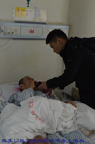 在护士长的精心安排下,每个病房由4至6名学生负责为病人服务,学生们热情十足,有的为病人倒水,有的在护士指导下,帮助病人进行体能训练。还有的学生与病人亲切交谈、聊天,缓解他们的病痛和心理压力。有一位外地病人,因脑疾病,特意来到北京治疗,进行开颅手术后,脑神经受到损伤,语言产生了障碍。王钺凯同学十分同情这位病人,与他手拉手,共同坐在病床边促膝谈心,并鼓励病人要有坚强的信念,积极配合治疗,争取早日恢复健康!病人家属非常感动,不断地对我院学生表示称赞!陈丹妮、王雪园、叶小丹同学特意带了上课时所用化妆用品,利用自己所学专业技术,为医护人员与患者传授化妆知识,得到医院领导一致好评。在此次学雷锋活动中,每位同学都付出了自己最真挚的爱心,也得到了一次最纯洁的心灵净化,做到了以实际行动弘扬雷锋精神,进一步推动了班级精神文明建设,为创建文明班级做出了每个人的贡献。