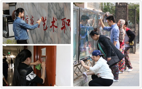 部分班级在校内进行学习雷锋义务劳动的活动,例如中专民舞13班为公寓二层、三层的宿舍擦洗门窗;高职音乐14班打扫京剧苑小花园;中专京表11班修理文化教室的桌椅、擦洗学院的宣传栏等。