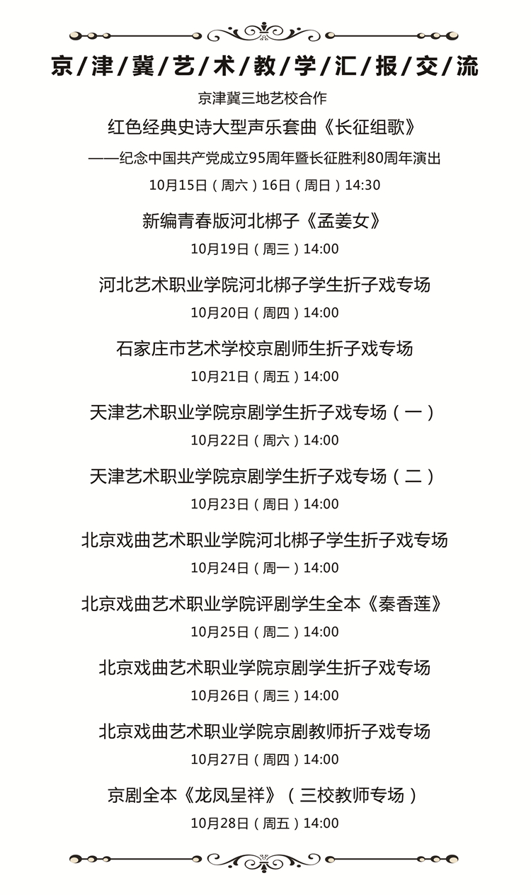 2016年10月15-28日,京津冀三地艺术职业院校——石家庄市艺术学校、河北艺术职业学院、天津艺术职业学院、北京戏曲艺术职业学院的师生将齐聚北京戏曲艺术职业学院少儿戏剧场,参加2016京津冀艺术教学汇报交流演出。本次展演是继2015年12月三地四校签署京津冀艺术职业教育协同发展框架协议、成立联盟以来,联盟成员共同举办的大型教学汇报交流演出活动。