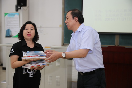 院长刘侗赠送《北戏韵律》、《京剧大家绝艺录》及《武生大家的嘱托》给台湾戏曲学院带队老师李光玉