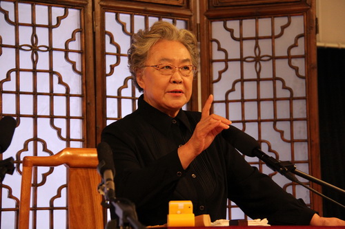 继而由连丽如作了一小时四十分钟的讲座。她以《东汉•武科场》为例,说演结合,对评书的结构、笔法与艺术手段进行了讲解。她认为,评书是纯粹的口头文学艺术,说的就是演员头脑里的东西,头脑中的意境用语言反映出来,使观众如临其境,如见其形,即是为评书。她还强调了评书中“倒座子”(即正义的反方)的作用,以及说书如何从铺垫到进入正题,“摆切末儿”(布景)的重要性等等。