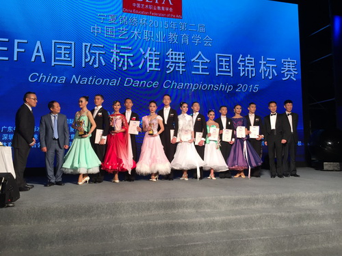 第二届中国艺术职业教育学会“锦绣杯”全国国际标准舞锦标赛于2015年11月6-7号在深圳举办,我院国标舞专业中专11级学生在比赛中取得了优异成绩,为学院争得了荣誉!靳德昭、张丹清荣获了18岁A组标准舞第一名、付欧、张竞心荣获了18岁A组标准舞第三名、徐磊、祁月荣获了18岁A组第六名;付欧、张竞心荣获了16岁A组标准舞第一名、王继明、杜雯莉荣获了16岁A组标准舞第二名。