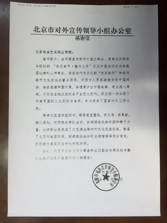 2016年2月15日,北京市对外宣传领导小组办公室给我院发来感谢信。