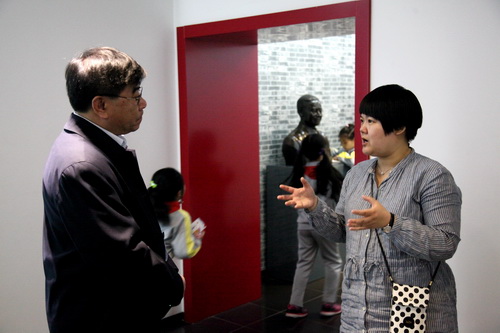 学院办公室主任王静为新开路东总部小学领导介绍京剧展的情况
