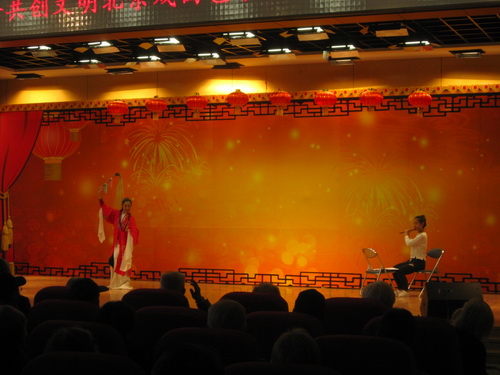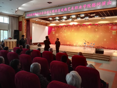 演出由中专京表2013班郑晶晶同学表演的《打龙袍》拉开序幕。随后,京剧、曲艺、歌曲、舞蹈、器乐演奏等一个又一个精彩的节目博得了老人们的阵阵掌声。许多老人在欣赏完演出后非常开心和激动,拉着演员的手表示感谢,久久不愿意放开。