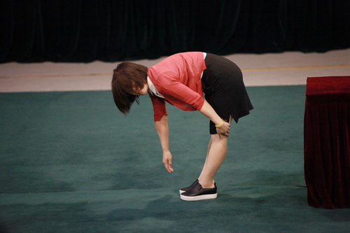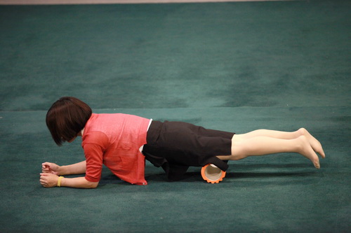随后,鹿教授为我们细致地演示了如何运用GASS训练计划科学地进行运动。一是控制体重、合理膳食从而有效地改善体质,二是通过有氧锻炼和伸展运动达到锻炼身体肌群,减轻、缓解、防治腰背疼痛。此外鹿教授还提醒我们在科学运动时不可忽视的细节:要充分热身、适当进行放松和牵拉、运动后不能马上进食、补充水分要充分等等,并亲自在垫上示范了使用泡沫轴放松肌肉,缓解肌肉疼痛的方法。