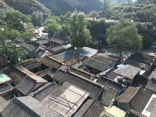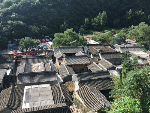 站在关帝庙前,远望四面群山,山脉起伏蜿蜒,气势壮观,山形奇异优美,有的形如虎、如龟、如蝙蝠,山势有陡有缓,山景丰富多彩,令人想起古人“寒山转苍翠,秋水日潺湲”的动人诗句。