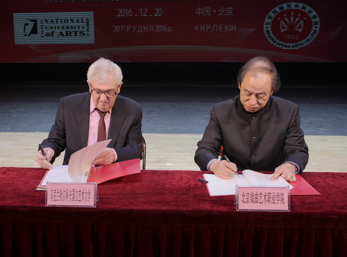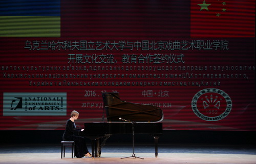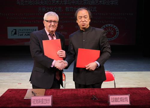 首先各领导观看了由中方和乌方带来的演出。刘侗院长在演出后致辞,他表示,北戏迎来了建院64年历史中第一个国际合作的伙伴——乌克兰哈尔科夫国立艺术大学。我们衷心地感谢哈尔科夫大学的领导对北戏办学的支持,祝愿北戏的学子能够在底蕴深厚人才辈出的哈尔科夫国立艺术大学茁壮成长,并且衷心地祝贺今天两校成功地签署合作协议。在今后的日子里,两所学校的领导、老师、学生将一起携手,为中国与乌克兰的文化交流、教育合作贡献智慧和力量。哈尔科夫国立艺术大学第一副校长阿巴江•加利教授表示,签署双方合作协议将会成为哈尔科夫国立艺术大学历史上非常最重要的一笔。与北戏合作协议的签署将开启中乌关系发展崭新的篇章。党委书记刘宝华表示,期盼着双方在发挥各自优势的基础上,更加紧密合作,并且,我们相信通过合作交流,双方的友谊一定会与日俱增,我们的合作结果一定会结出丰硕的成果。最后,北京市文化局副局长吕先富作重要讲话。北戏是民族文化艺术传承、实践的重要教育基地之一,是培养出很多优秀戏曲艺术表演人才的摇篮;而哈尔科夫国立艺术大学传承了哈尔科夫这座有着悠久历史文化名城的优良传统,积淀了宝贵的艺术财富,其音乐表演及戏剧、舞台艺术在乌克兰乃至世界享有盛誉,也为世界培养了许多杰出的艺术人才而闻名遐迩。希望两校履行好合作协议中的各项内容,北戏可以借鉴哈尔科夫国立艺术大学办学的先进理念及治学经验,哈尔科夫国立艺术大学可以通过北戏更好地了解中国的戏曲文化教育。希望通过两校签订合作协议,增进中乌文化艺术交流,推动中外优秀文艺作品创作生产,繁荣音乐艺术及舞台艺术。通过两校间的成功合作,融入到国际“一带一路”建设中,借此开创更广泛的世界文化艺术交流。