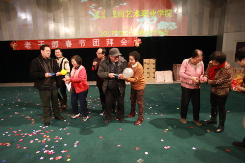 首先,出席团拜会的院领导分别向老干部致新年贺词,刘侗院长因身体生病未能出席团拜会,但是他通过手机短信向全体老干部表达了真挚地祝福。刘宝华书记代表学院领导班子从党和国家新形势下推出的重大举措、热点问题,联系到学院的新发展、新变化,对曾经为学院发展做出贡献的老同志们表达了由衷的感谢。老干部处副处长张嵌诗做了2016年老干部工作总结及经费使用情况说明。毕兆炜副书记作为老干部工作的主管领导,从老干部工作难点、经费管理以及今后慰问形式的转变向老干部们进行了说明。毕书记的讲话,使老同志们理解了上级的文件精神,确保了我院老干部工作的稳定推进。随后,刘宝华书记、毕兆炜副书记分别为2016年度新退休人员颁发光荣退休证书和退休纪念品。在一首深情的生日快乐歌中,全体院领导为属鸡老干部送上生日礼品。今年的联欢会为加强老干部和在职人员的沟通,特邀我院舞蹈系赵克军老师和人事处谢志刚老师表演节目,他们的精彩演出受到了老干部们的热烈欢迎。中间穿插的游戏及院领导抽奖环节更使得此次联欢会高潮迭起。在一首《没有共产党就没有新中国》的集体合唱中,老干部春节团拜会在喜庆、祥和的气氛中圆满结束。
