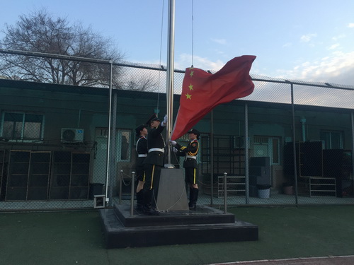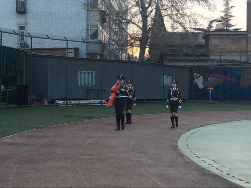 为更好地加强爱国主义教育,提升学生整体精神面貌,规范升旗仪式,学生处为升旗仪仗队配备了崭新的军装礼服。7点整,英姿飒爽的旗手们穿着整齐的服装,迈着矫健的步伐护送鲜艳的五星红旗入场,伴着庄严的《中华人民共和国国歌》,五星红旗冉冉升起,迎风飘扬,大家用注目礼向祖国表达无限的热爱和崇高的敬意。