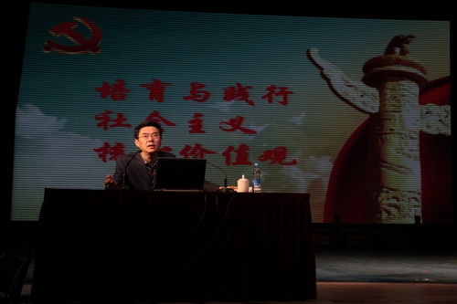 在讲授过程中,刘书记从价值观的基本概念引入社会主义核心价值观,结合国际背景、国内形势、社会现象、个人经历、生活实际,分别从国家层面、社会层面、个人层面细致入微的讲授了核心价值观24字的内涵。然后分别从国内国际大局深刻的变化;推进国家治理体系和治理能力现代化的要求;提升民族和人民的精神境界;实现民族复兴中国梦的宏伟目标四个方面深刻分析了核心价值观的重要意义。最后,结合学生实际给学生提出了践行社会主义核心价值观的三点要求:一是当代青年应该认同民族文化,坚定价值观自信,用社会主义核心价值观作为自己成长成才的精神指导;二是在日常的学习生活中,坚持勤学、修德、明辨、笃实;三是要求学生走在时代改革前列,担当历史重任,为实现中华民族伟大复兴中国梦凝聚青春力量。