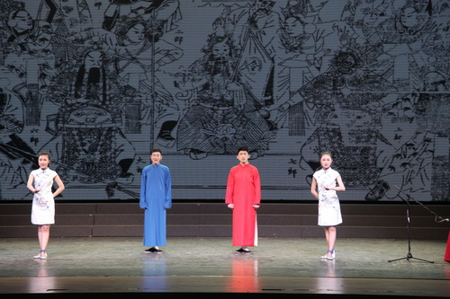 《中华美德故事汇》是首都文明办、与北京市文化局联合策划,首都文明办出品,由我院创作演出的系列舞台短剧,它集戏曲、话剧、音乐剧、舞剧、曲艺等多种艺术形式,运用生动的舞台艺术形式弘扬传统美德和传承传统艺术,以文化人、以文育人,为首都思想道德建设贡献了力量。此次汇报的第三辑剧目是2016-2017年我院创排演出的原创剧目,以“爱国”题材为主,包括话剧《守护》、联珠快书《托兆碰碑》、评剧《与妻书》和音乐剧《国之歌》。首都文明办副主任卜秀均、北京市文化局副巡视员马文、首都文明办未成年人工作处处长常建军、北京戏曲艺术职业学院院长刘侗、党委书记刘宝华,以及人民音乐出版社黄志鹏主任和天津艺术职业学院范恩源院长等专家观看了首演。