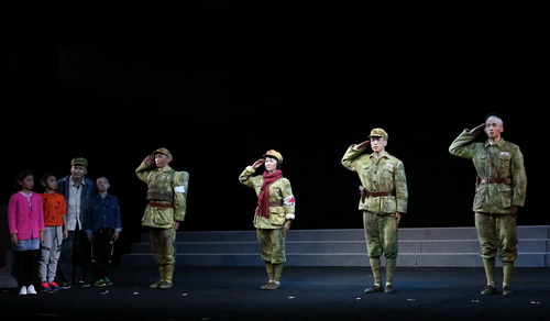 之后,《中华美德故事汇》短剧话剧《守护》和音乐剧《国之歌》的演出开始,这是2016-2017年我院创排的《中华美德故事汇》第三辑中的优秀剧目,以“爱国”题材为主。话剧《守护》讲述了1948年,在新中国成立前的最后决胜阶段,为了截断国民党部队对东北战场的支援,解放军华北野战军第四旅奉命在河北昌黎阻击敌人,当地村民王文彬怀着对解放军战士的崇拜和敬仰之情支援战士们作战。随着战争的深入,敌人发起了猛烈的攻击,连长夏凤翔带领的23名战士全部壮烈牺牲,以身殉国,王文彬带着战士们的嘱托掩埋了烈士的遗体并以64年的行动实现了一生守护烈士墓的承诺。音乐剧《国之歌》主要讲述了1935年初抗日战争期间,聂耳在田汉、夏衍等左翼爱国作家的影响下不畏时局环境险恶和个人的安危,主动请缨为《义勇军进行曲》作曲的过程,以此表现聂耳强烈的爱国热忱和卓越的创作才华。