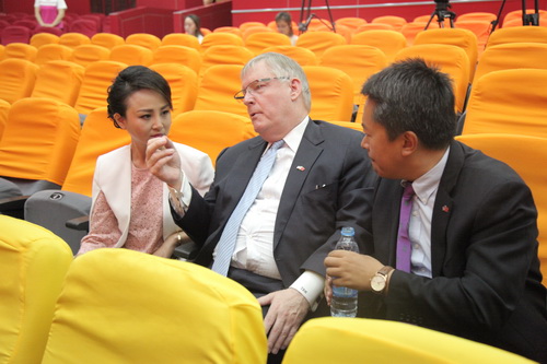 MILLS先生一行首先参观了学院京剧展,在认真听取接待人员介绍的同时,向接待人员提出问题,并进行讨论。参观京剧展完毕,在贵宾厅,学院院长刘侗、党委书记刘宝华亲切接见了MILLS先生一行,对他们的到来表示由衷的欢迎,并向三位贵宾赠与学院制作的高档礼品,希望日后有机会能够开展合作。之后,MILLS先生一行观看了由北戏师生联合出演的京剧选段。