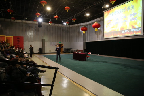 其次,由学院邀请到的防火中心宋晓龙教官进行了消防知识培训,讲解了学校防火知识,讲授了怎样防止火灾的发生、如何报警、报警的方式方法、如何在火场进行逃生自救,讲解了如何扑救初起火灾、如何组织师生逃生等知识。最后讲解了家庭中如何防止火灾发生及家庭火灾应对方法。