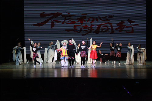 联欢会接近尾声,由民舞2017、2016班、京剧2017、2014班共同完成的结尾节目《传承》,将舞蹈、小品、京歌等多种表演形式融合在一起,以轻松的方式阐释深刻道理,在表演中渗透着同学们对中国传统艺术的热爱与追求,为中国梦的实现作出自己的承诺。