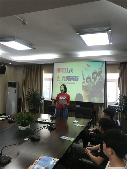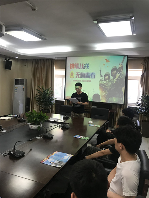 汇报结束后,丰台区武装部政治科石科长也就自身的军旅生涯经历与感悟向同学们做了交流,石科长饱含真挚感情,用质朴的语言与学生分享了在部队的那段激情燃烧的岁月,生动形象地讲述了在部队里生活、训练的点点滴滴,并对有应征入伍意向的大学生提出了自己衷心的建议。他用自身参军经历动员鼓励广大同学切实把握机遇,把参军入伍作为锻炼自我、磨砺自我、提升自我的重要途径,将自我价值的实现融入到中华民族伟大强军梦的实践中,到祖国最需要的地方去实现自身理想。