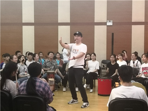 此次活动分为上下两场,每场一个小时。活动的引导师是北京悦诺文化传媒有限责任公司的宋涵宇老师。宋老师为大家简单介绍了各种鼓和其他乐器的名称及击打方法后,活动正式开始,先是热身游戏、教师示范,然后是节奏演练、音乐共创,同学们在引导师的带领下相互配合、团结协作,在节奏中体验着快乐,在互动中感受着和谐、在创作中表现着活力。这里没有舞台表演的压力,没有乐谱的羁绊,音乐只是人们心灵的表达;这里没有所谓的错误,你可以充分表达自己、展示自己、创造不同的自己;这里你不再孤独,无数个跃动的心灵与你相伴,你可以与他们一起,酣畅淋漓!活动中,同学们全情投入、激情四射,共同创造了一支支美妙的心灵节奏,欢快的鼓声响彻整个音乐大厅。