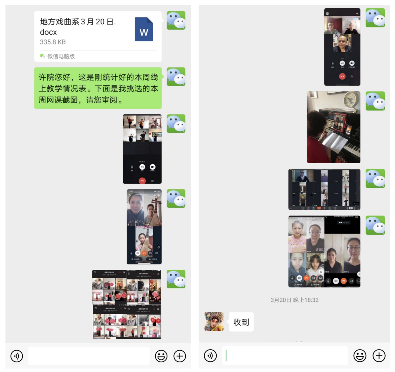 开学前夕,根据学院发布的线上教学准则与注意事项,地方戏曲系将具体细则传达到每一位教师,要求教师遵守并执行学院的各项规定。线上调试、授课期间,系部为每位专业教师建立专属线上授课文件夹,教师按照规定提交视频、图片等教学台账,系部统一收集并保存。