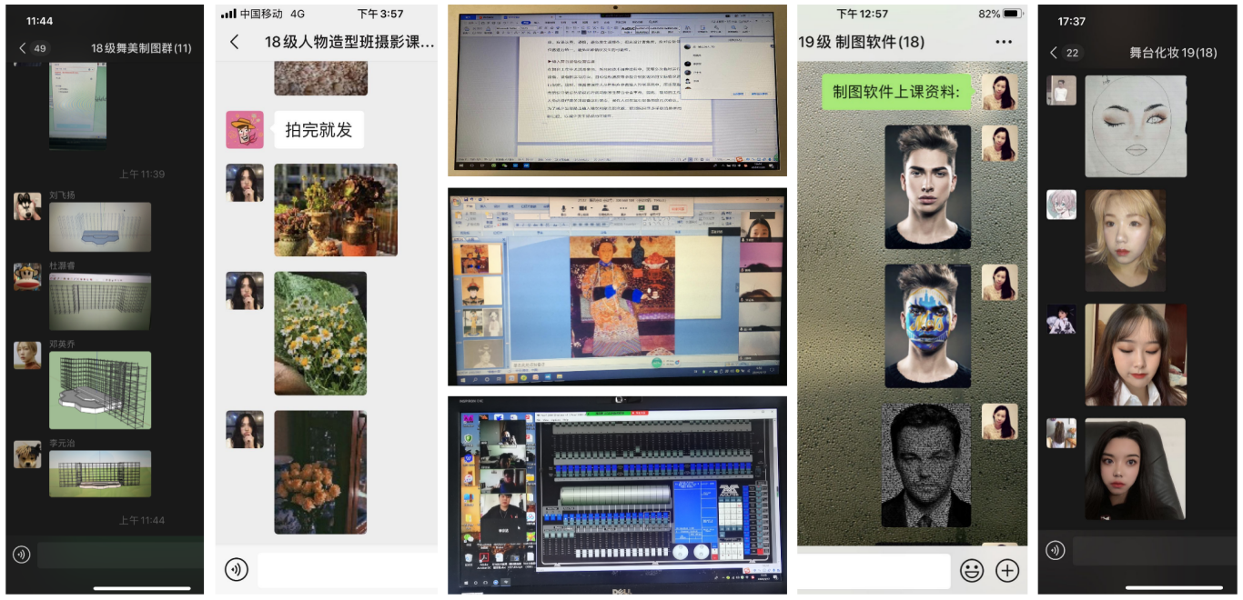为保证线上教学的效果,备课至深夜已成为很多舞美系教师的常态。为准备好一节课,老师们努力搜集线上教学资源,积极调试线上教学软件,精心设计打磨教学内容和课件,认真布置学习任务,开展在线教学答疑。尤其是为了选择好最适合自己课程的信息化手段,老师们尽显“十八般武艺”,广泛使用微信、瞩目、钉钉、腾讯会议等各类线上沟通和交流平台进行授课。