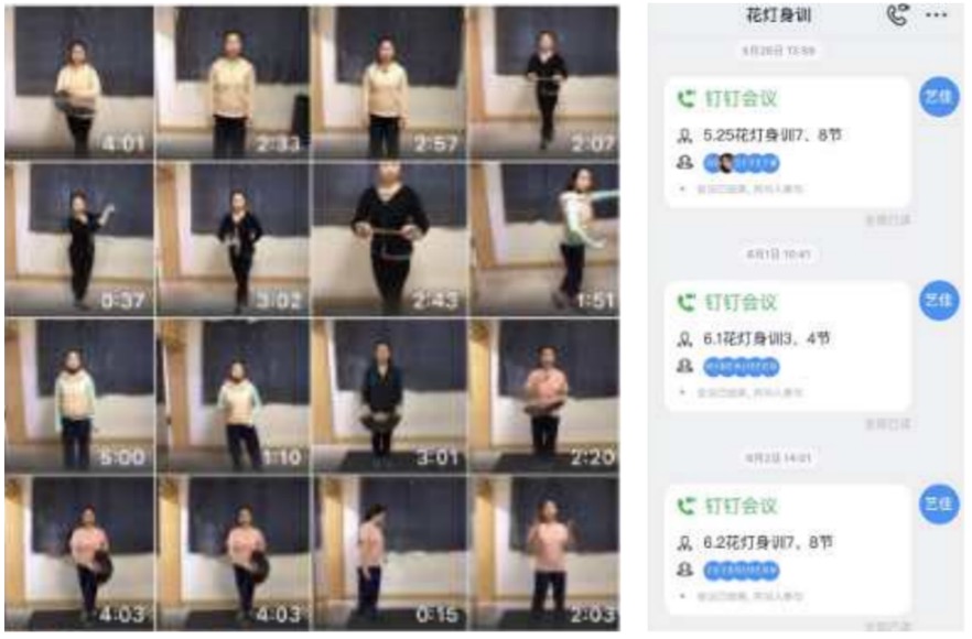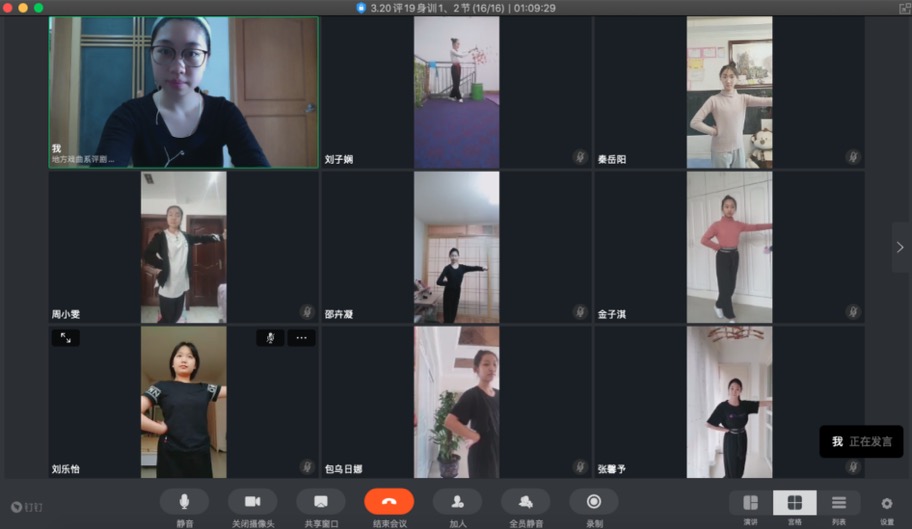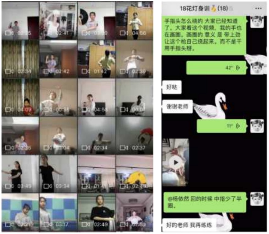 线上教学的确有多重限制,但这段时间的锻炼也挖掘了学生潜力、激发了学习热情。因无法直接地看到老师的示范,而是要通过摄像头进行转换,学生在学习时就必须加入自己的思考和理解,养成了专注认真、勤于动脑的习惯。大部分学生的主观能动性有所加强,课上,她们会注意观察其他同学的动作,寻找优点和不足;课下,他们经常一起在线复习,互相帮助,还会请老师通过视频纠正动作。场地不合适就创造条件,网络不流畅就克服困难,没有道具就用家里的日用品代替。