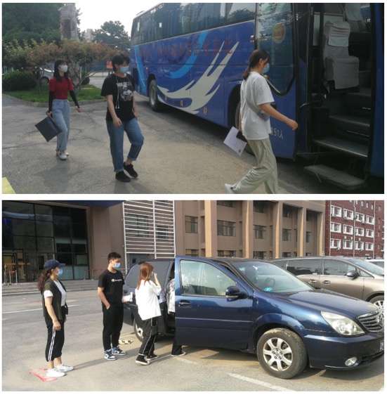 本次考试正处于首都疫情防控形势严峻时期,6月20日上午,学院院长黄珊珊亲自到校指挥,强调了考试注意事项,缓解同学们考试前的紧张心理。教务处老师和班主任为考生准备了充足的口罩、消毒纸巾等防疫物品,根据考试时间分两批将学生送到指定考场,每辆送考车配有带队老师,上午11点半,顺利完成考试,安全返校。