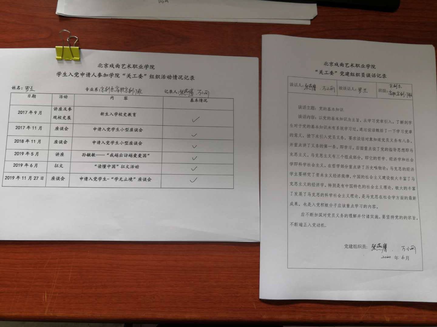 根据学院关工委工作计划,7月初,学院关工委党建组织员为2017届21名申请入党毕业学生填写《谈话记录表》和《参加学院关工委活动情况记录表》,并完成和招就办的交接,将这些考察培养材料存入学生档案。