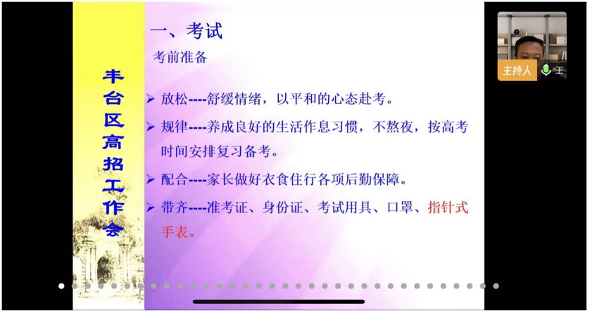 根据北京市丰台区高招工作会议精神,本次考前教育详细介绍了我院的考试情况,并对考生提出具体要求。今年全国高考将于7月7日—10日举行,我院考生参加考试的地点是北京市第十八中学,全体考生要参照全国统一考试时间表,合理安排好作息,精心做好考前防疫准备,确保安全顺利参加考试。会议再次提醒考生认真执行考场规则,并预祝同学们取得好成绩。