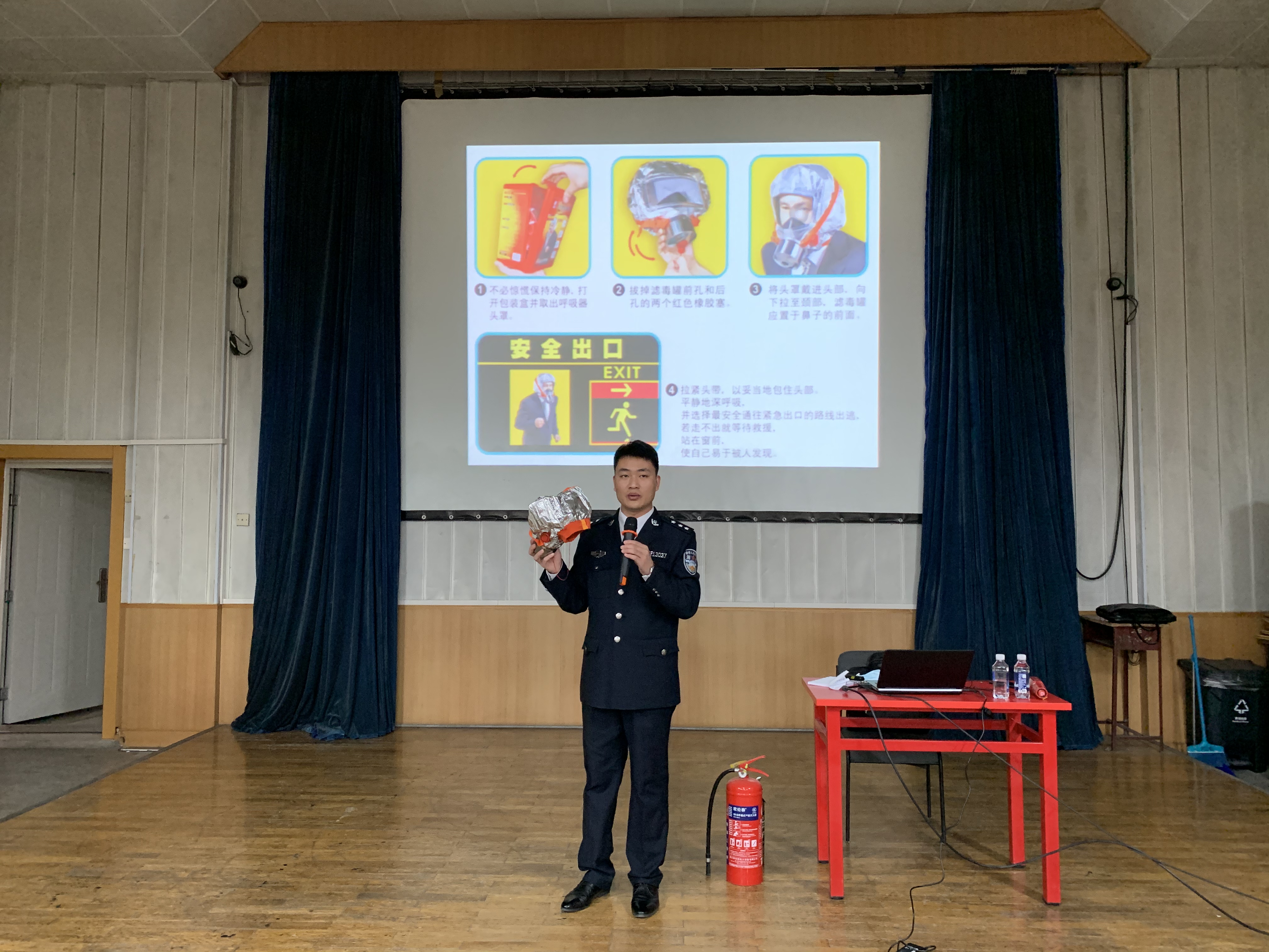 程主任讲解示范防火头罩佩戴方法