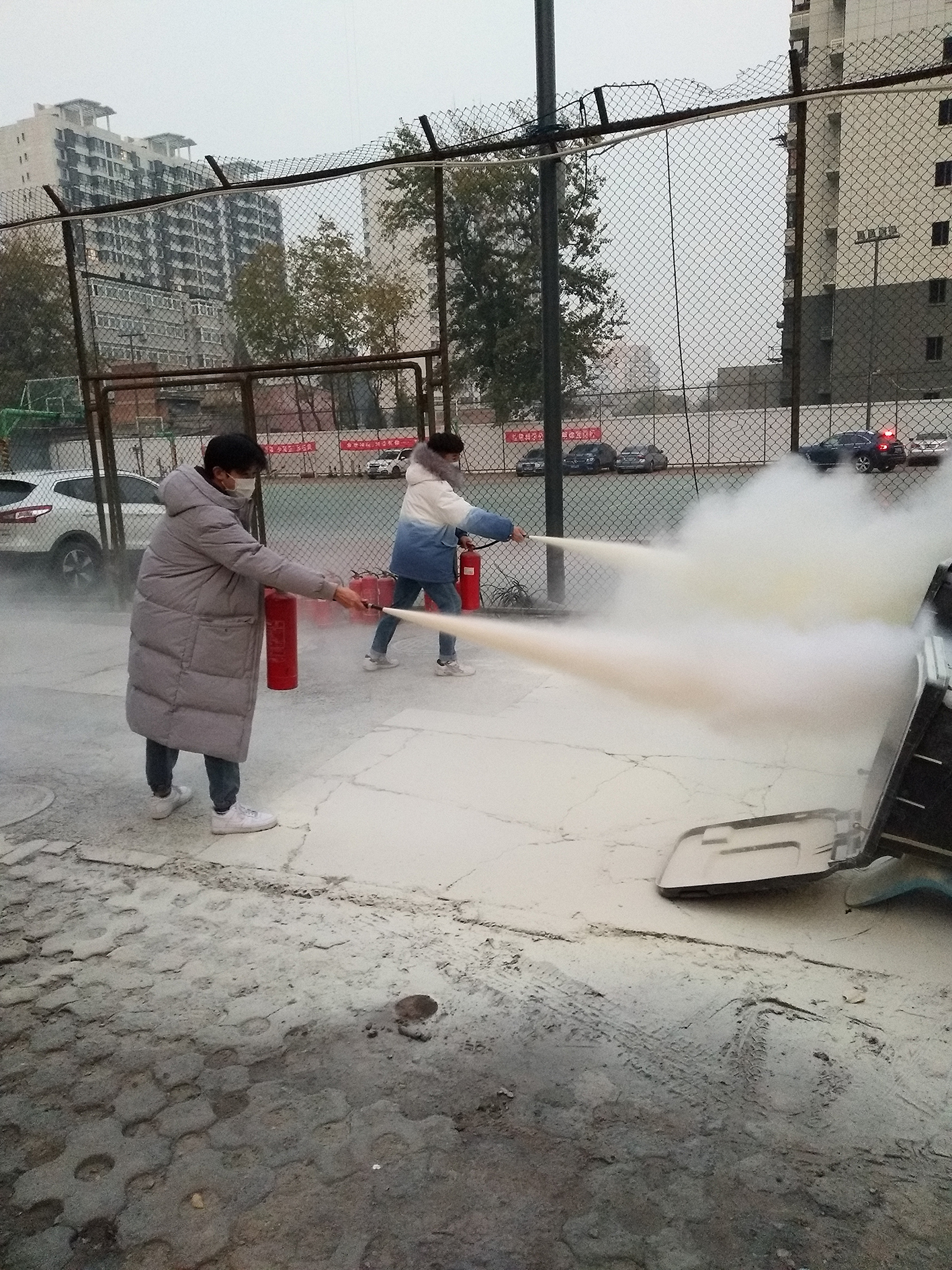 学生公寓逃生演练结束后由综合管理处李发龙老师对2020级新生进行了消防技能培训。李老师用简洁生动的语言将灭火器的操作使用总结为“一提、二拉、三握、四压、五喷”,并指导公寓生活指导老师和2020级新生进行灭火器实操演练。