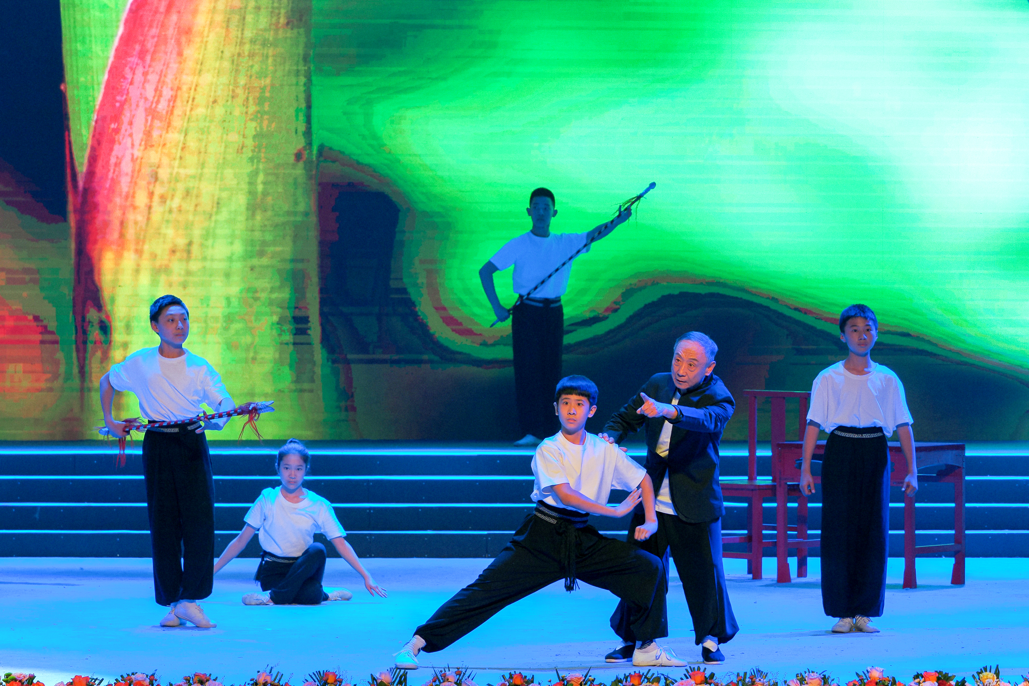 在演唱会中,京剧系学生参加节目《国风·传承》的演出,这个节目以学生日常练功的形式展现,别具一格地将京剧身法功夫展示编排融进故事感,带领观众走近梨园弟子的练功日常。师徒相授,薪火相传,冬练三九,夏练三伏,台上行云流水的完美手眼身法步背后,是日复一日的艰苦训练与自我磨砺。学生们身着练功服,精神饱满、认真积极,这不仅体现了北戏学生的精神面貌,更加体现了作为青年人的朝气。演出中与著名表演艺术家杨少春先生同台,表现出京剧艺术传与承之间的密切联系。