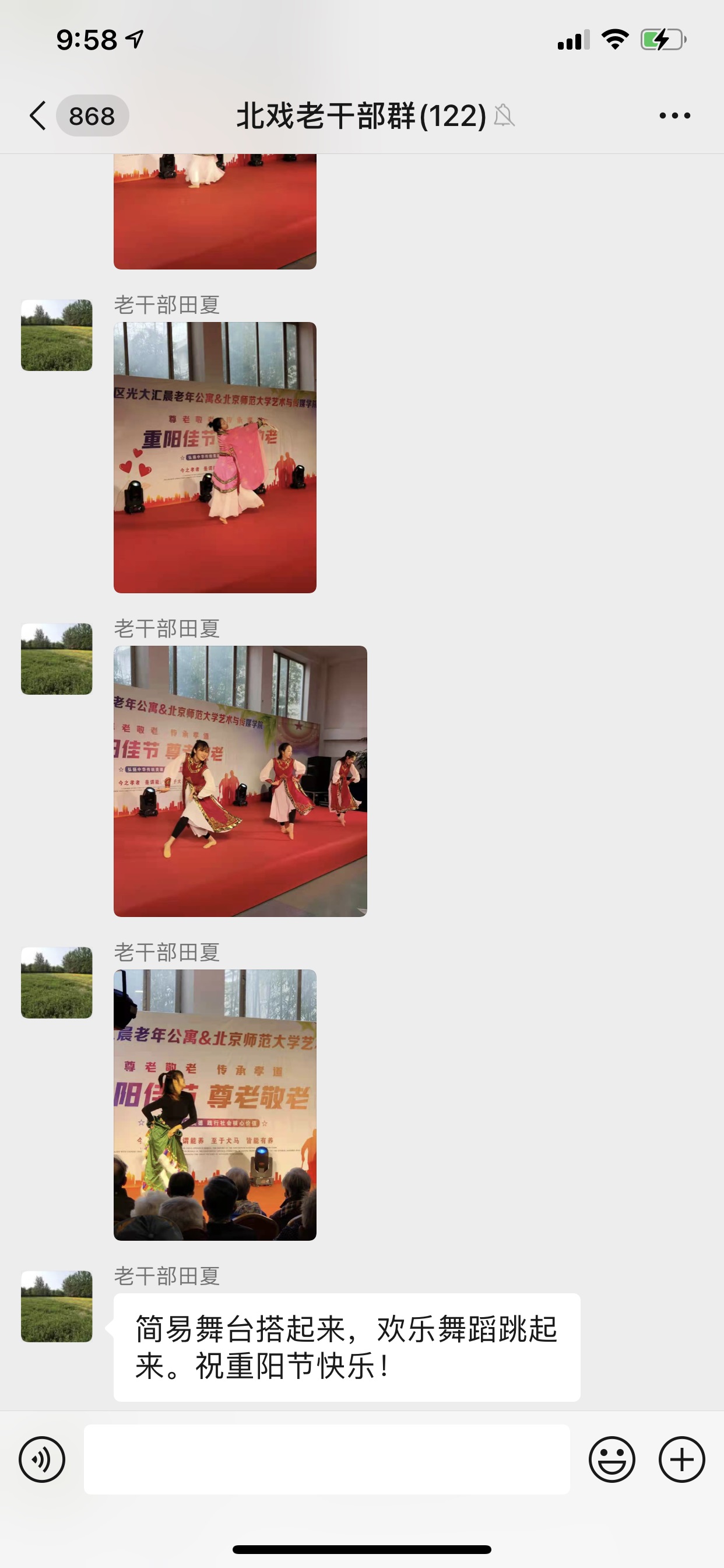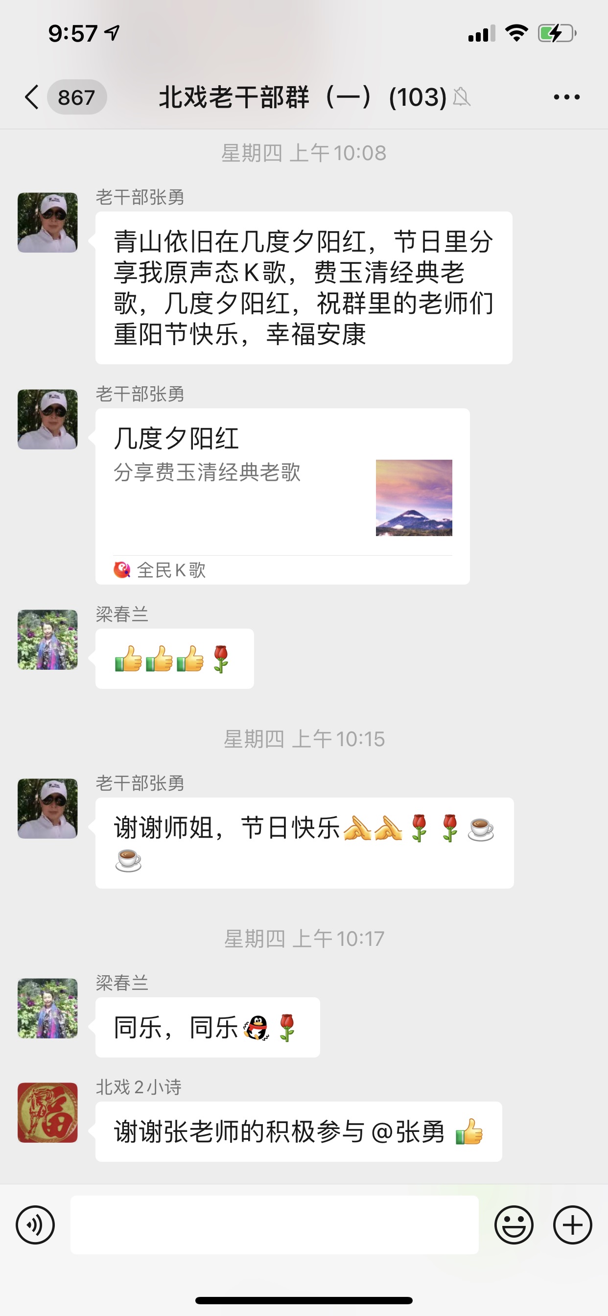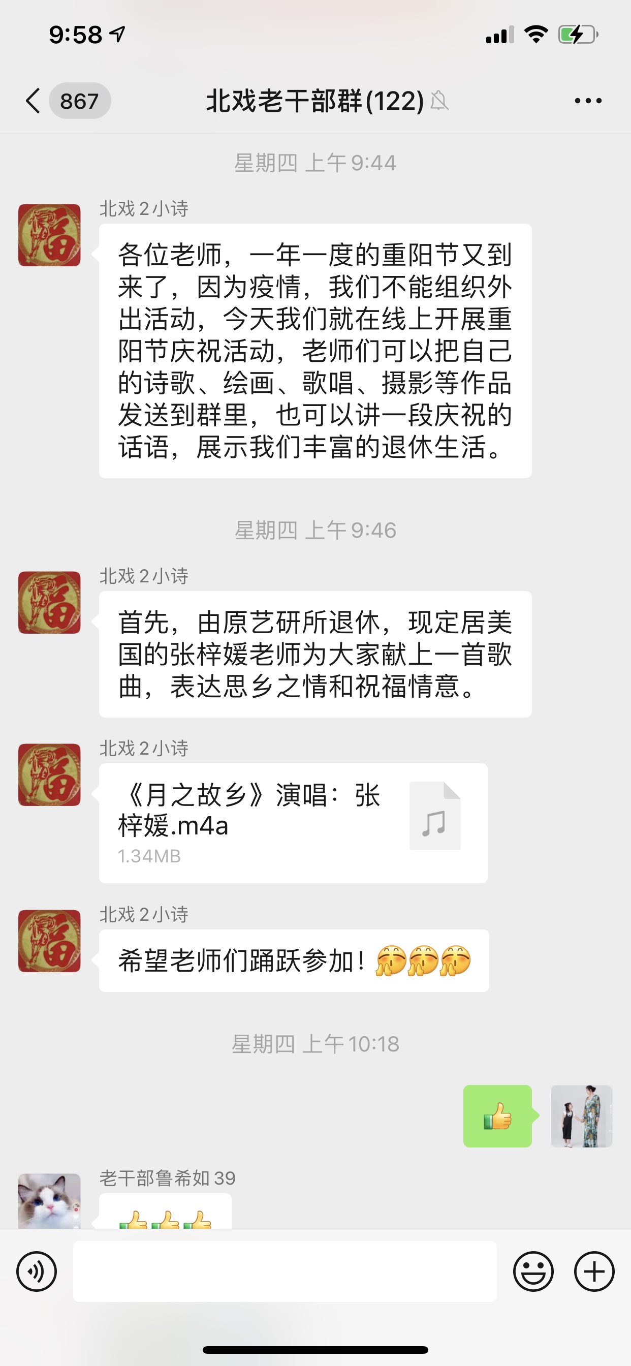 为进一步传承敬老爱老的传统,让我院老干部过上一个快乐的重阳节,今年结合疫情防控常态化的实际情况,在10月14日重阳节当天我院开展线上重阳节联欢会,老干部们通过5个微信群纷纷送上重阳节祝福语和祝福图片,还有很多老干部群朗诵诗歌、歌唱表演、展示书画摄影作品。远在美国定居的原艺研所退休人员张梓媛老师献上歌曲《月之故乡》,表达思乡之情和祝福情意;83岁的刘继昌老师将自己拍摄的照片发到群里,祝福老师们重阳节快乐;88岁的岳淑梅老师发来画作《富贵吉祥》;王如昆老师晒了一张老照片,让老师们的记忆又回到了青春时代;在养老公寓居住的田夏老师,发来艺术团到养老院慰问演出的照片;张勇老师为大家献上一首《几度夕阳红》;80岁的张卉老师不仅为大家朗诵了女诗人李清照的《声声慢》,还为大家献上一首自己家乡内蒙古的歌曲《在那遥远的地方》,尽管因为疫情大家不能见面,但是线上联欢会的组织不仅展示了老干部们丰富的退休生活,还让大家度过了一个温馨快乐的重阳节!